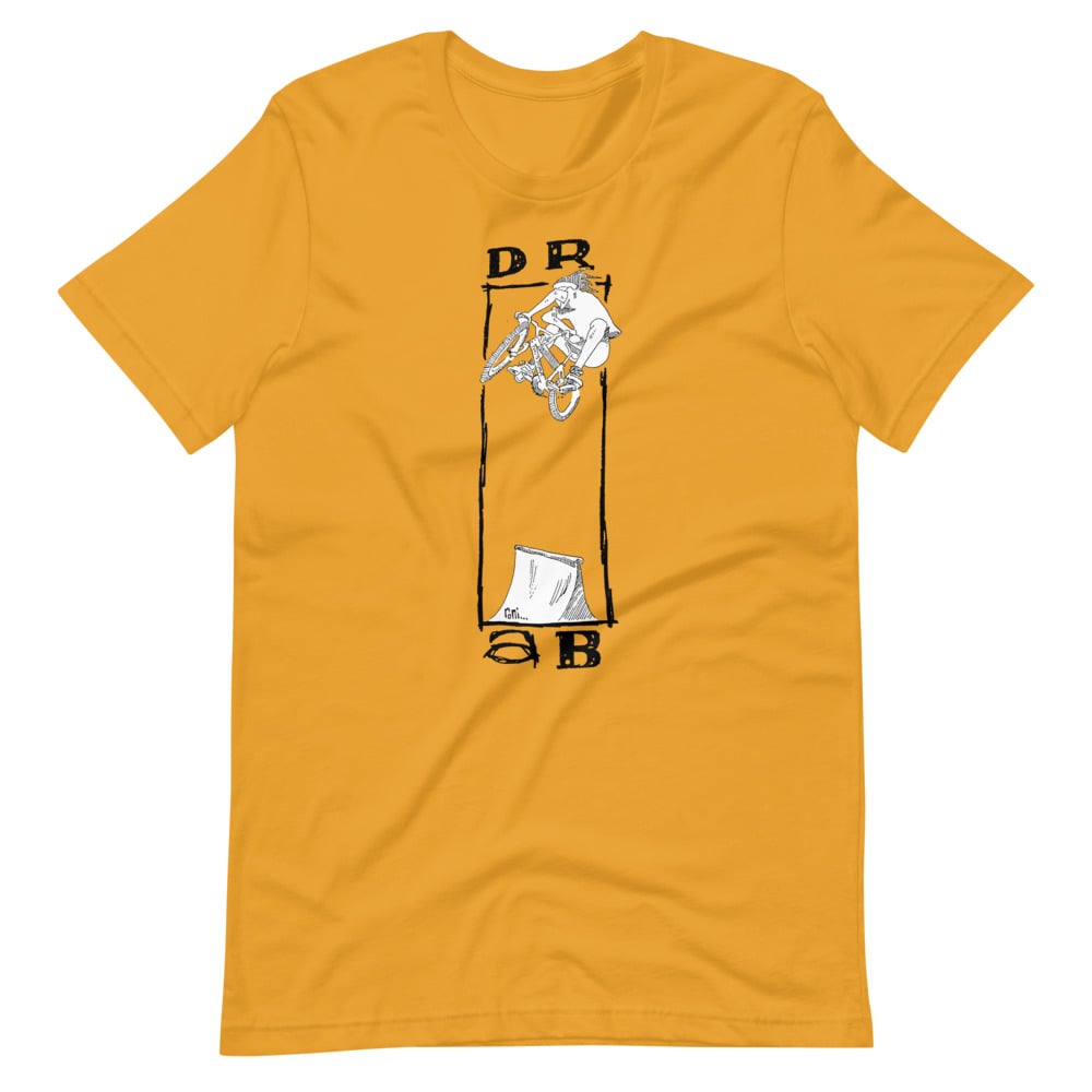 Drab Designs was a tiny t-shirt “company” I started with my buddy Tim Brown in the early 90s. Maybe you spotted our microscopic ads in GO Magazine? Anyway, pen pal Roni had contributed this killer artwork to the cause, but before it became a shirt, Drab Designs folded. Well, better late than never with this mustard, 100% combed and ring-spun cotton beauty!